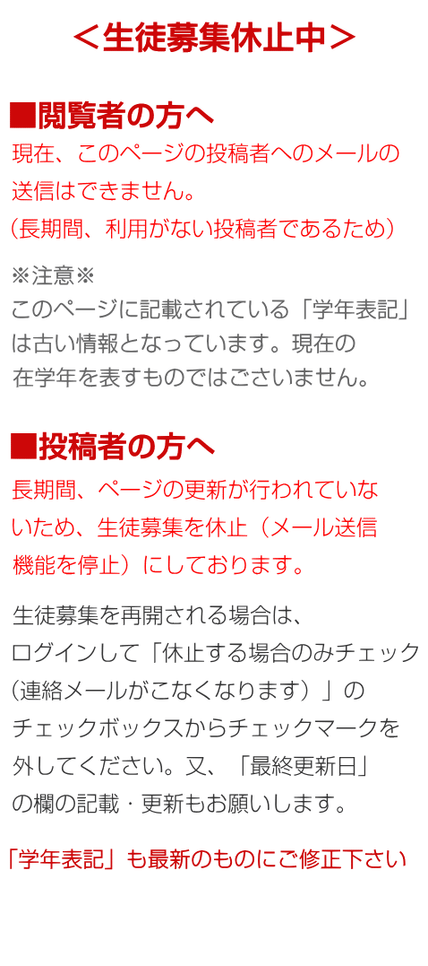 家庭教師の総合情報の生徒募集掲示板(個人契約掲示板)です。 紹介料・掲載料・登録料など一切無料で個人契約・直接契約ができます。教師・生徒ともに完全無料ですが、個別サポートは一切行いませんので自己責任でご利用下さい。 ご利用の際は必ず「ご利用方法・規約」をご一読下さい。 【利用制限】 家庭教師の個人契約以外の目的での利用を禁じます。家庭教師業者及び塾等による投稿・教師への依頼などを禁じます。 違反した場合は注意喚起のため業者名・塾名を公表いたします。 【先生をお探しの方へ】 「E-Mail」をクリックすると、投稿者へメールを送信するフォームに繋がります。 質問・依頼・打診のメールを送信することができます。 利用方法の詳細につきましては「ご利用方法・規約」のページをお読み下さい。 初回面談の際には必ず、身分証・学歴を証明するもの(学生証や卒業証明書)の提示を求めて下さい。 個別サポートは一切行っておりません。個人の責任で投稿・メールのやり取り・打診・契約を行って下さい。 【生徒をお探しの方へ】 掲載をご希望の方は、投稿フォームからご投稿下さい。 ご利用の際は必ず「ご利用方法・規約」を必ずご覧下さい。 投稿内容を修正・削除する場合は、修正・削除フォームに「投稿番号(投稿No.)」と「パスワード(PASS)」を入力し、ログインして修正・削除をして下さい。 個人契約は競争が激しく、生徒さんが見つかるのに時間がかかりますので、指導先を早く見つけたい方は、家庭教師会社への登録もあわせて行うことをお奨めします。 当サイトから、複数の家庭教師会社へのバイトの一括登録が可能です。 簡単・便利な「家庭教師のバイト一括登録」をあわせてご利用下さい。 静岡の家庭教師会社大手に一括で登録できます。 家庭教師会社大手への簡単「一括登録」で、早く家庭教師のお仕事がみつかります!家庭教師のバイト先を早く探したい方は、是非ご利用下さい。 ⇒⇒静岡の家庭教師会社へのバイトの一括登録はコチラ